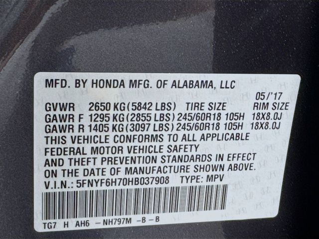 USB Port, MP3- USB / I-Pod Ready, Hands Free Calling, Back Up Camera, 18" Alloy Wheels, 3rd row seats: split-bench, 4-Wheel Disc Brakes, 4.25 Axle Ratio, 7 Speakers, ABS brakes, Air Conditioning, Alloy wheels, AM/FM radio: SiriusXM, Apple CarPlay/Android Auto, Auto-dimming Rear-View mirror, Automatic temperature control, Brake assist, Bumpers: body-color, Compass, Delay-off headlights, Driver door bin, Driver vanity mirror, Dual front impact airbags, Dual front side impact airbags, Electronic Stability Control, Emergency communication system: HondaLink Assist, Exterior Parking Camera Rear, Four wheel independent suspension, Front anti-roll bar, Front Bucket Seats, Front Center Armrest, Front dual zone A/C, Front fog lights, Front reading lights, Fully automatic headlights, Garage door transmitter: HomeLink, Heated door mirrors, Heated Front Bucket Seats, Heated front seats, Illuminated entry, Leather Shift Knob, Leather-Trimmed Seats, Low tire pressure warning, Navigation System, Occupant sensing airbag, Outside temperature display, Overhead airbag, Overhead console, Panic alarm, Passenger door bin, Passenger vanity mirror, Power door mirrors, Power driver seat, Power Liftgate, Power moonroof, Power passenger seat, Power steering, Power windows, Radio data system, Radio: AM/FM Audio System, Rear air conditioning, Rear anti-roll bar, Rear reading lights, Rear seat center armrest, Rear window defroster, Rear window wiper, Remote keyless entry, Security system, SiriusXM Radio, Speed control, Speed-sensing steering, Speed-Sensitive Wipers, Split folding rear seat, Spoiler, Steering wheel mounted audio controls, Tachometer, Telescoping steering wheel, Tilt steering wheel, Traction control, Trip computer, Variably intermittent wipers. Gray AWD