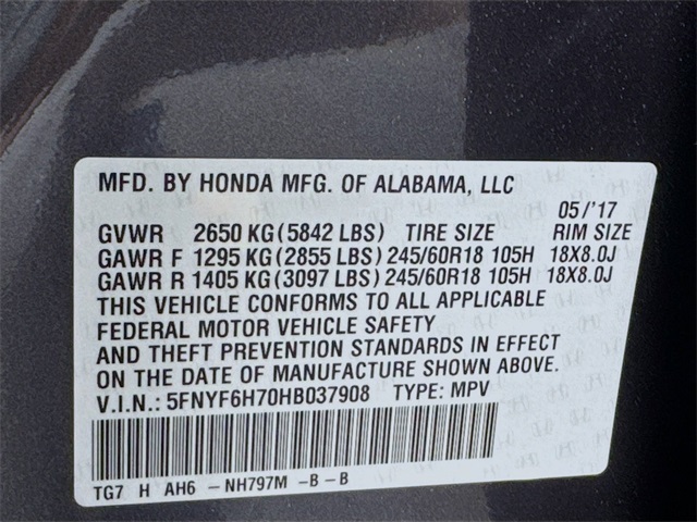 * 2017 IIHS Top Safety Pick+ (When equipped with Honda Sensing and specific headlights) * 2017 KBB.com 10 Best Certified Pre-Owned 3-Row SUVs Under $30,000 * 2017 KBB.com 12 Best Family Cars * 2017 KBB.com Best Buy Awards * 2017 KBB.com Brand Image Awards * 2017 KBB.com 10 Most Awarded Brands