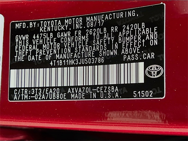 NAC Certified 7yr 100000 warranty. 2018 Toyota Camry SE Ruby MP3- USB / I-Pod Ready, Hands Free Calling, Back Up Camera, Bluetooth for Phone and Audio Streaming, Clean Carfax, REPAIR ORDER $2.038.01, NEW FRONT WIPER BLADES, ALIGNMENT, NEW WHEEL LOCK, NEW BRAKES, NEW ROTORS, NEW CABIN FILTER, NEW AIR FILTER, NEW OIL FILTER, 4-Wheel Disc Brakes, 6 Speakers, ABS brakes, Air Conditioning, Alloy wheels, AM/FM radio, Auto High-beam Headlights, Automatic temperature control, Brake assist, Bumpers: body-color, Carpeted Floor Mats & Trunk Mat Package, Delay-off headlights, Door Edge Guards, Driver door bin, Driver vanity mirror, Dual front impact airbags, Dual front side impact airbags, Electronic Stability Control, Exterior Parking Camera Rear, Fabric Seat Trim w/SofTex, Four wheel independent suspension, Front anti-roll bar, Front Bucket Seats, Front Center Armrest, Front reading lights, Fully automatic headlights, Illuminated entry, Knee airbag, Leather Shift Knob, Low tire pressure warning, Occupant sensing airbag, Outside temperature display, Overhead airbag, Overhead console, Panic alarm, Passenger door bin, Passenger vanity mirror, Power door mirrors, Power driver seat, Power steering, Power windows, Radio data system, Radio: Entune 3.0 Audio, Rear anti-roll bar, Rear reading lights, Rear seat center armrest, Rear side impact airbag, Rear window defroster, Remote keyless entry, Security system, Speed control, Speed-sensing steering, Split folding rear seat, Spoiler, Sport steering wheel, Steering wheel mounted audio controls, Tachometer, Telescoping steering wheel, Tilt steering wheel, Traction control, Trip computer, Variably intermittent wipers, Wheels: 8.0J x 18" Black Machined-Finish Alloy.